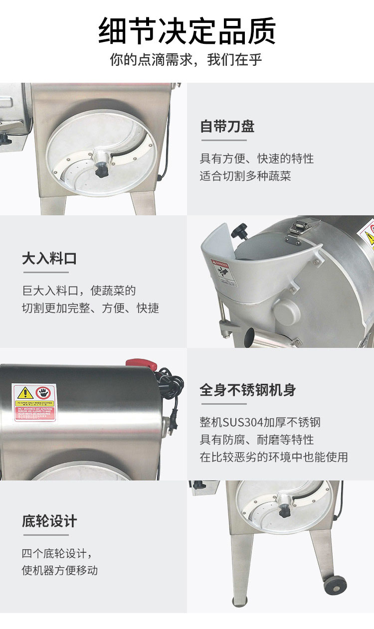 • 产品简介:土豆萝卜类蔬菜切片切丝切丁块机,一机多用,切菜速度快,切菜均匀美观,整机不锈钢材质,产地:整机台湾生产,质量保障。...