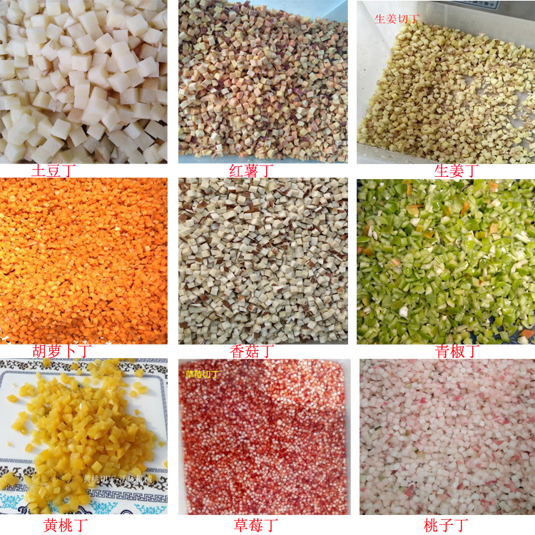 主要用于:土豆 萝卜 胡萝卜 地瓜 芋头 莴笋 黄瓜 茄子 辣椒 莲藕 苹果 梨 猕猴桃 菠萝 哈密瓜 草莓 黄桃 火腿肠等切丁或块。